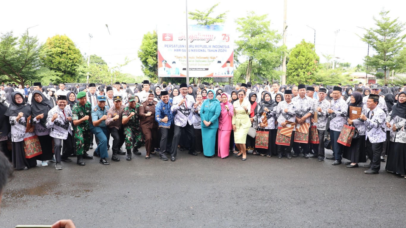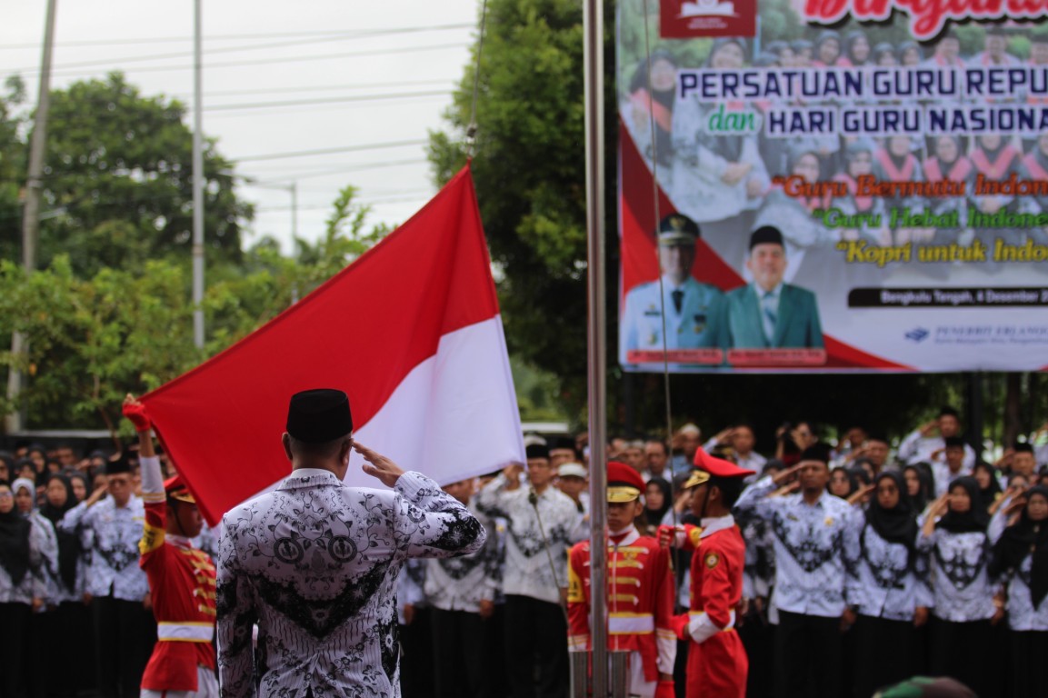 Bertindak sebagai inspektur upacara Pj Bupati Bengkulu Tengah Dr.Heriyandi Roni, M.Si., hadir langsung Unsur Forkopimda Kabupaten Bengkulu Tengah, Pj Sekretaris Daerah Bengkulu Tengah Drs. Hendri Donal, S.H.,M.H., Pj Ketua TP PKK Bengkulu Tengah dr.Dian AR Heri Roni, Asisten dan Staf Ahli Bupati, Kepala OPD, Ketua PGRI Bengkulu Tengah, para ASN dilingkup Pemerintahan Kabupaten Bengkulu Tengah serta undangan lainnya.