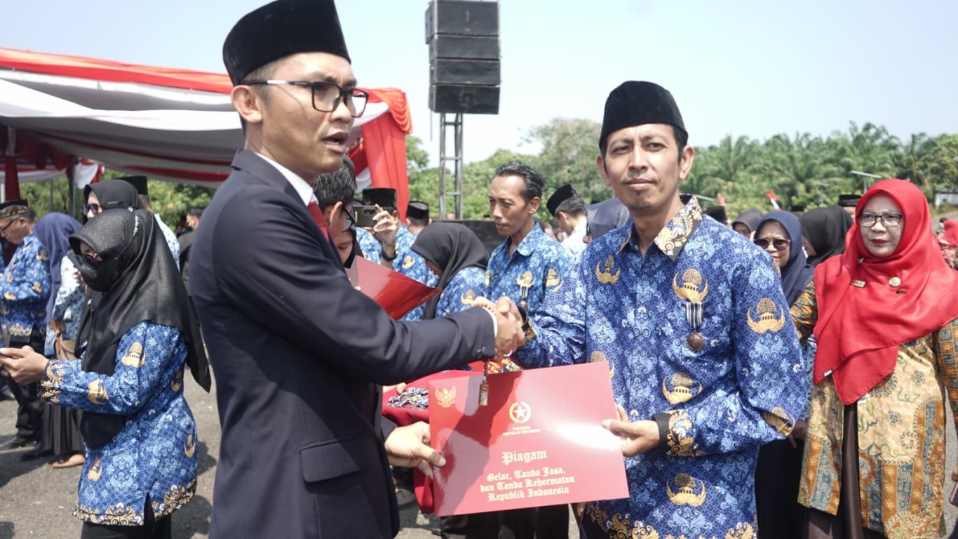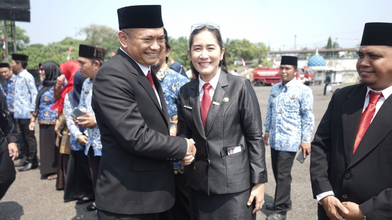 Bengkulu Tengah - Kepala Dinas Komunikasi Informatika dan Statisktik (Diskominfotik) Kabupaten Bengkulu Tengah Rahmat Apriadi, S.STP., M.E beserta Istri mengikuti Upacara Detik-Detik Proklamasi HUT Ke 79 Republik Indonesia di Lapangan Gunung Bungkuk Kabupaten Bengkulu Tengah.